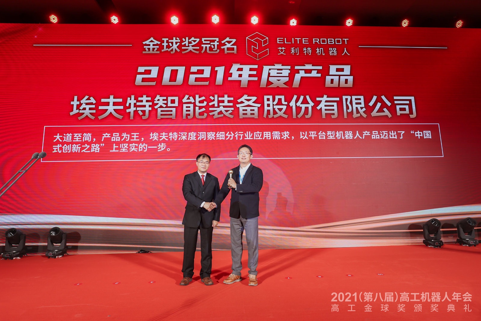 憑借專業(yè)的技術(shù)能力和優(yōu)異的解決方案,埃夫特斬獲了(第八屆)高工機器人金球獎:2021 年度產(chǎn)品獎。