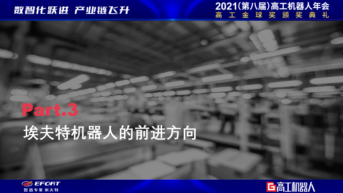 同期,本屆年會特設(shè)了以“高瞻遠矚 躍進飛升”為主題的閉幕式專場,作為國產(chǎn)機器人第一梯隊企業(yè) ,埃夫特2021年迎來了高質(zhì)量發(fā)展期的開局之年,埃夫特副總經(jīng)理王富康應(yīng)邀發(fā)表了“國產(chǎn)機器人崛起之路”的主題演講。